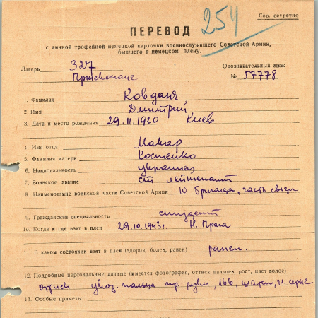 Ковданя Дмитрий Макарович, 29.11.1920 г. р., Киев. Старший лейтенант, 10 бригада, часть связи. Попал в плен 29.10.1943 г. в г. Новая Прага. 24.01.1945 г. – попал в госпиталь Зандбостель.