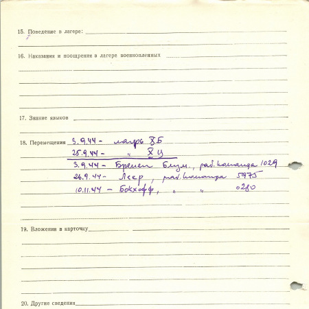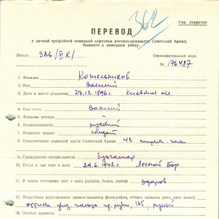 Котельников Василий Василевич, 27.12.1896 г. р., Киевская область. Рядовой, 42 стрелковый полк. Попал в плен 29.06.1942 г. в с. Лесной Бор. 10.11.1944 – отправлен в Бокхофф, рабочая команда 0280.