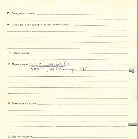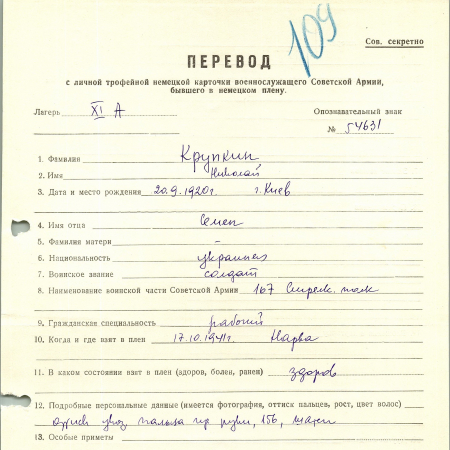 Крупкин Николай Семенович, 20.09.1920 г. р. Киев. Рядовой, 167 стрелковый полк. Попал в плен 17.10.1941 г. в г. Нарва. 04.11.1944 г. – отправлен в рабочую команду 395.