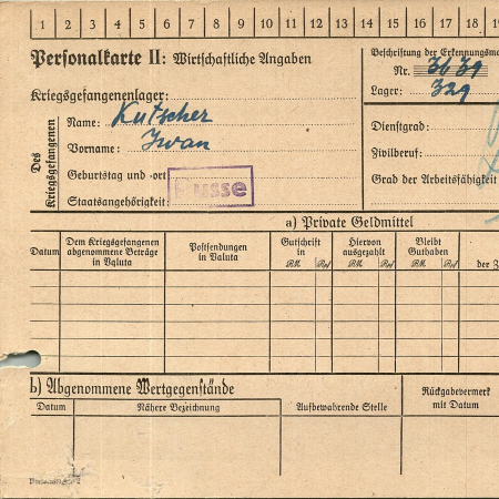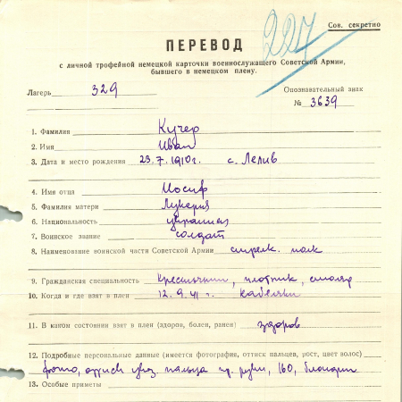 Кучер Иван Иосифович, 23.07.1910 г. р., с. Лелив, Чернобыльский район, Киевская область. Рядовой, стрелковый полк. Попал в плен 12.09.1941 г. в с. Кобеляки. 08.11.1942 – лагерь ХII А.