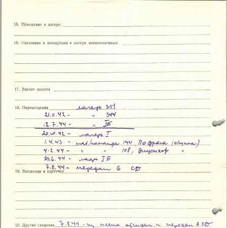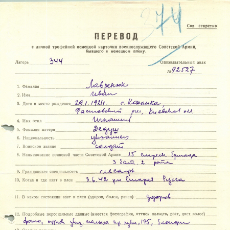 Лавренюк Иван Игнатович, 29.01.1921 г. р., с. Кожанка. Рядовой, 15 стрелковая бригада, 3 батальон, 2 рота. Попал в плен 03.06.1942 г. в р-не Старая Русса. 07.08.1944 г. – был отчислен из плена и передан в СД.