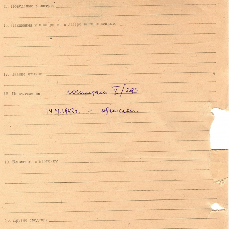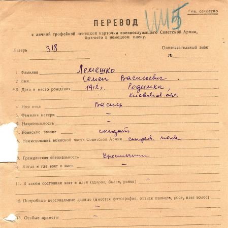 Лемешко Семен Васильевич, 1912 г. р., Родимка, Киевская обл. Рядовой стрелкового полка. 14.04.1942 г. – был отчислен из плена.