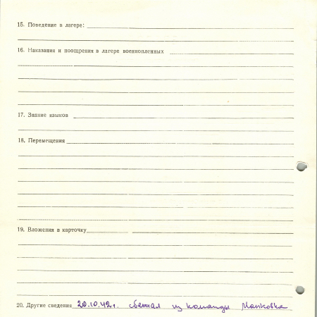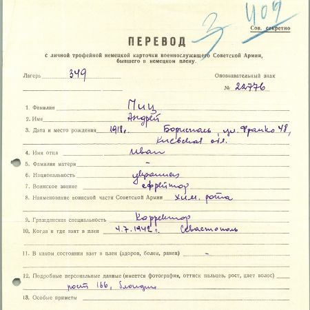 Пиц Андрей Иванович, 1918 г. р., Борисполь, ул. Франко, 48. Киевская область. Ефрейтор, химическая рота. Попал в плен 04.07.1942 г. в г. Севастополь. 20.10.1942 г. – бежал из плена из команды Манковка.