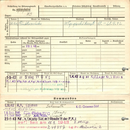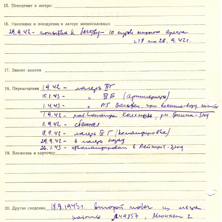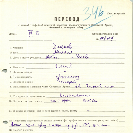 Семенов Михаил Елисеевич, 1907 г. р. Киев. Рядовой, 62 артиллерийский полк. Попал в плен 30.07.1941 г. в Литве, 18.09.1943 г. – совершил побег из места работы А49857, Мюнхен 2.