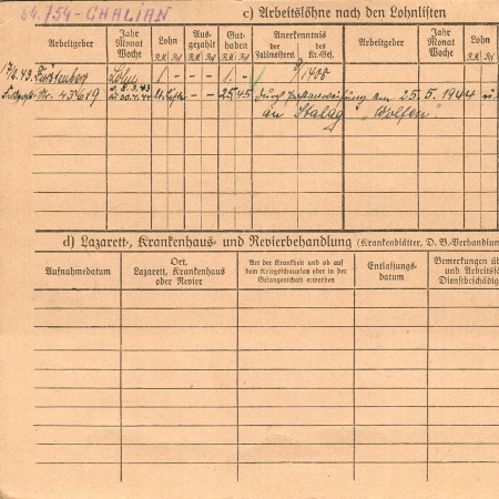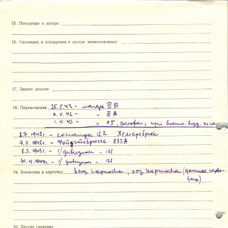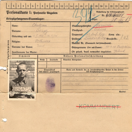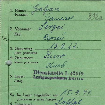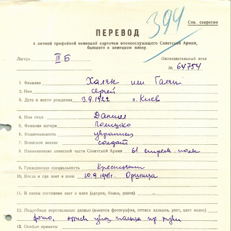 Халян (Галян) Сергей Данилович, 13.09.1922 г. р., Киев. Рядовой, 61 стрелковый полк. Попал в плен 10.09.1941 г. в г. Оршица. 30.04.1944 г. – направлен в 1/дивизион – 121.