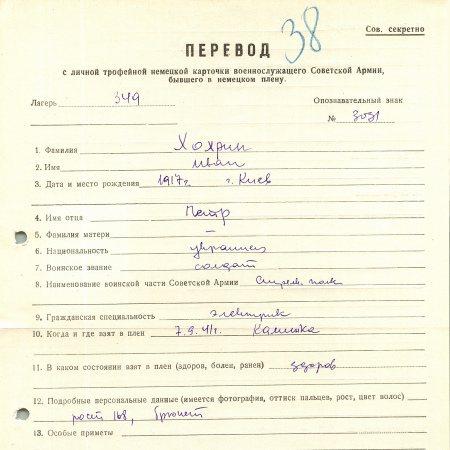 Хохрин Иван Петрович, 1917 г. р., Киев. Рядовой, стрелковый полк. Попал в плен 07.09.1941 г. в с. Каминка. 5 мая – бежал, пойман, 3 суток ареста