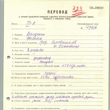 Ващенко Филипп Емельянович, 1909 г.р., с. Плютовище Чернобыльский р-н, Киевская обл. Рядовой, 654 стр. полк. Взят в плен 03.02.1944 г., Шепетовка.