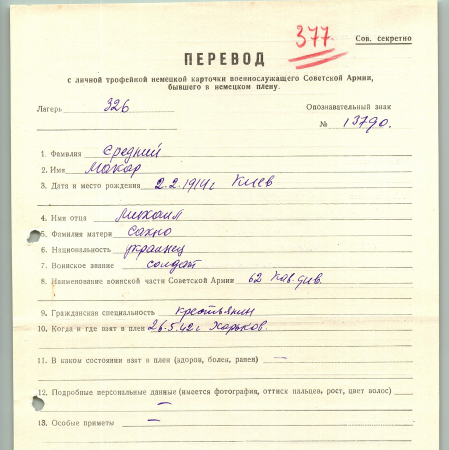 Рядовой, 62 кав. дивизия. Попал в плен 26.05.1942 г., Харьков.