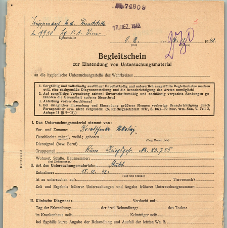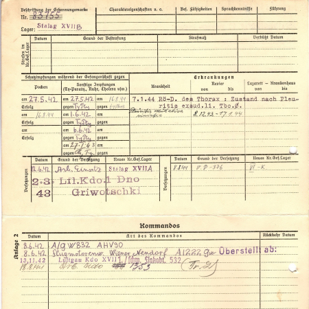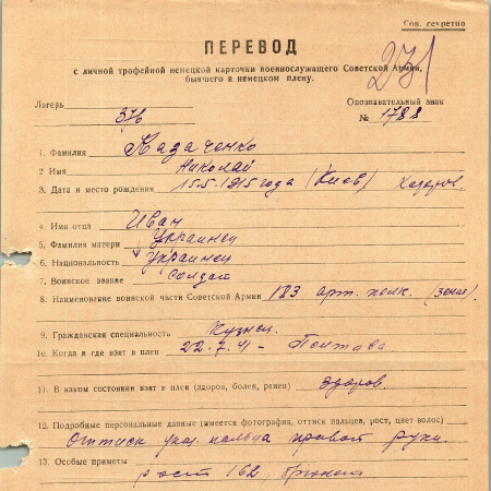 Казаченко Николай Иванович, 1915 г. р., Киев. Рядовой, 183 артиллерийский полк (зенит). Попал в плен 22.07.1941 г. в Полтаве, 18.08.1944 г. – попал в рабочую команду 353 Х VII / бат. 532 зенитная дивизия.