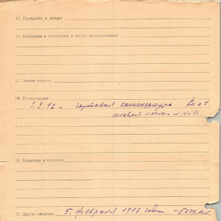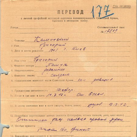 Каминский Григорий Григорьевич, 1901 г. р., Киев. Рядовой, 300 дивизия. Попал в плен 10.07.1942 г. – отправлен на Старый Оскол, 05.02.1943 г. – бежал из лагеря.