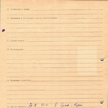 Костенко Филипп Ильич, 11.11.1919 г. р., с. Казимировка, Киевская область. Рядовой, 44 пулеметная часть. Попал в плен 29.06.1941 г. в «Деревне». 20.08.1941 г. – переправлен в Гросс-Розене.