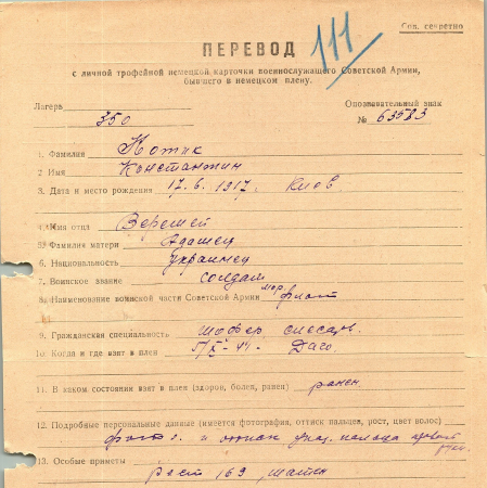 Котик Константин Веремеевич, 17.06.1917 г. р., Киев. Рядовой, морской флот. Попал в плен 05.10.1941 г. в Даго. Был ранен. 23.06.1944 г. – бежал из плена, не пойман.