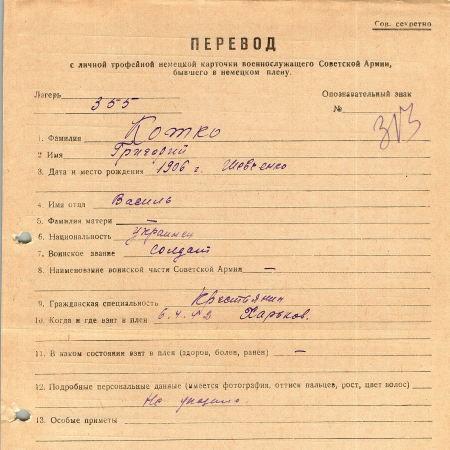 Котко Григорий Васильевич, 1906 г. р., д. Шевченко, Киевская область. Рядовой. Попал в плен 06.04.1942 г. в Харькове, 01.12.1942 г. – отпралвен в западный лагерь (Зинковцы).