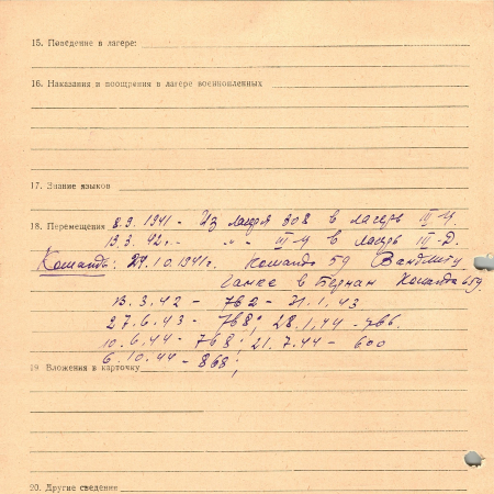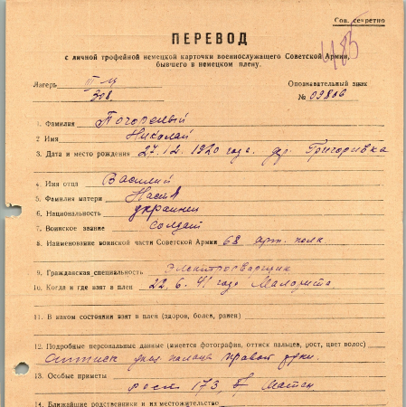Погорелый Николай Васильевич, 27.12.1920 г. р., д. Григорьевка. Рядовой, 68 артиллерийский полк. Попал в плен 22.06.1941 г. в Малорите. 06.10.1944 г. – отправлен в рабочую команду 868.