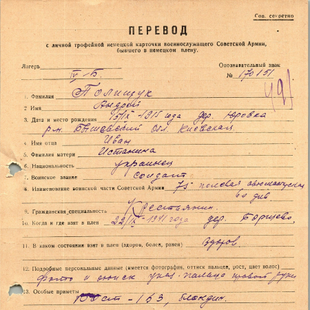 Полищук Андрей Иванович, 15.09.1915 г. д., Юровка, р-н Бышавский, Киевская область. Рядовой, 75 полевая автомастерская, 60 дивизия. Попал в плен 22.09.1941 г. в деревне Борщево. 05.07.1943 г. – направлен в Цвиккау Бюргермахт II.