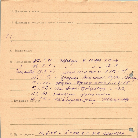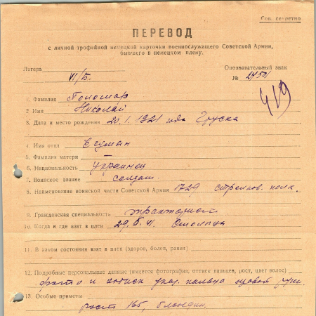 Поломар Николай Егуминович, 20.01.1921 г. р., с. Гуска, Киевская область. Рядовой, 1729 стрелковый полк. Попал в плен 29.05.1941 г, 10.06.1944 г. - бежал из плена, не пойман.