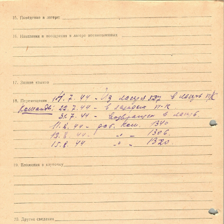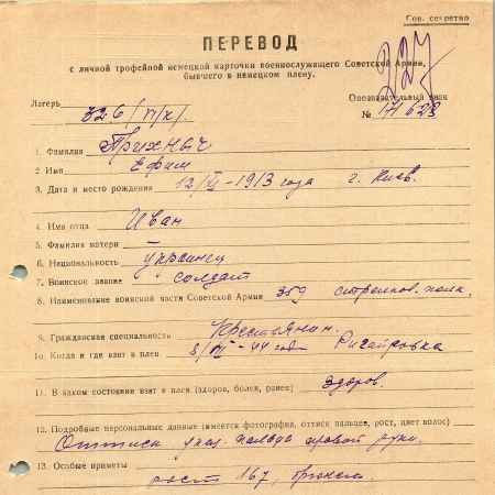 Прихныч Ефим Иванович, 12.11.1913 г. р., г. Киев. Рядовой, 359 стрелковый полк. Попал в плен 08.07.1944 г. в Ригайровке. 15.08.1944 г. – направлен в рабочую команду 1320.