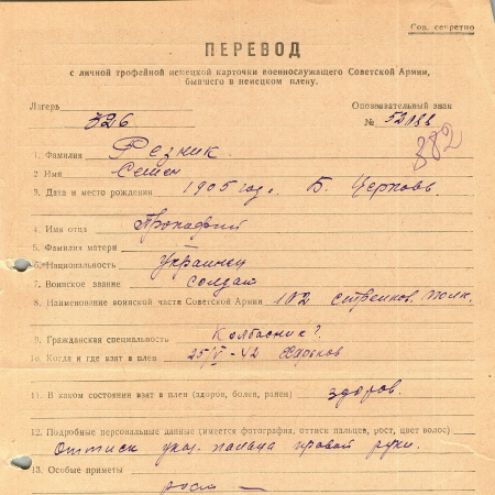 Резник Семен Прокофьевич, 1905 г. р., Белая Церковь, Киевская область. Рядовой,102 стрелковый полк. Попал в плен 25.05.1942 г. в Харькове. 18.10.1943 г. - 2 Ланд. рабочая команда 1322.