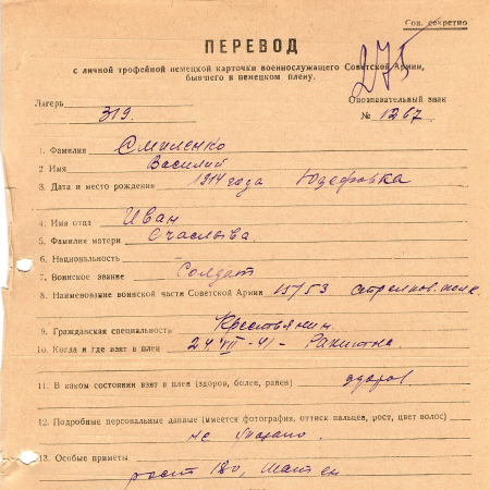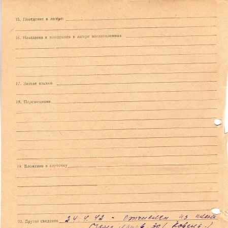Смиленко Василий Иванович, 1914 г. р. Рядовой, 15/53 стрелковый полк. Попал в плен 24.07.1941 г. – Ракитна, 24.02.1942 г. – отчислен из плена через лагерь 301 Ковель.