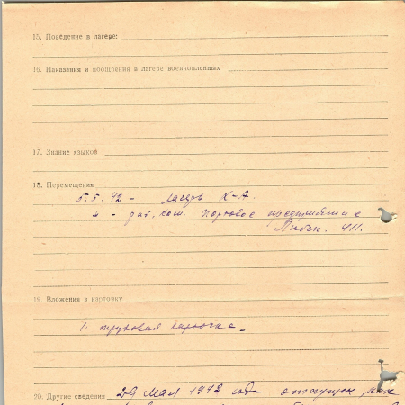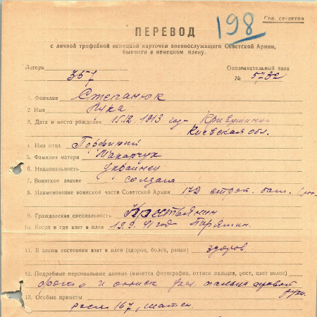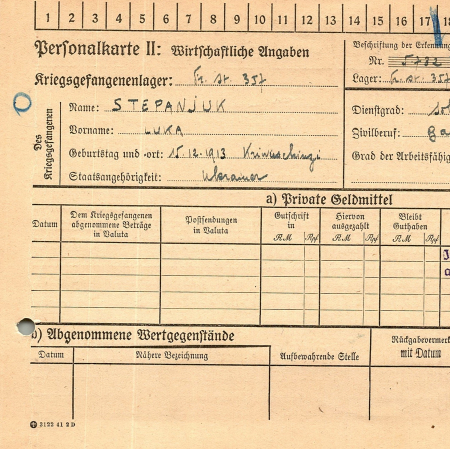 Степанюк Лука Порфирьевич, 15.12.1913 г. р., Кривошеинцы, Киевская область. Рядовой, 172 строительный батальон, 1 рота. Попал в плен 19.09.1941 г. в Пирятине. 05.05.1942 г. – переведен в лагерь Х-А, рабочая команда портовое предприятие Любек 411.