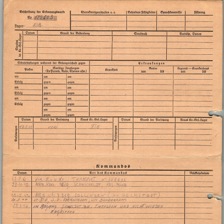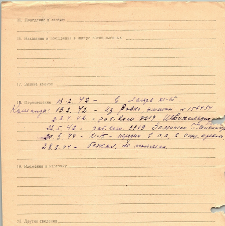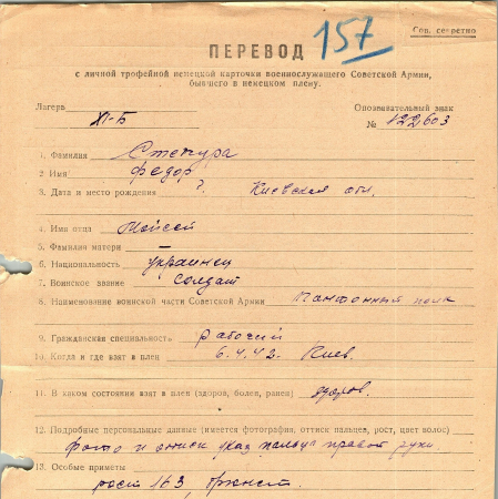 Степура Федр Моисеевич, родился в Киевской области. Рядовой, пантонный полк. Попал в плен 06.04.1942 г. в Киеве, лагерь XI Б. 13.02.1942г. - из Ровно направлен в эшелон №156434, 28.04.192 г. - в рабочую команду 3219 Швихельдт. 22.05.1942 г. отправлен в рабочую команду 3319 Золлинген, 20.03.1944 г. - в лагерь XI Б, передан в СД, в спец. арест. 28.03.1944 г.- бежал ил плена, не пойман.