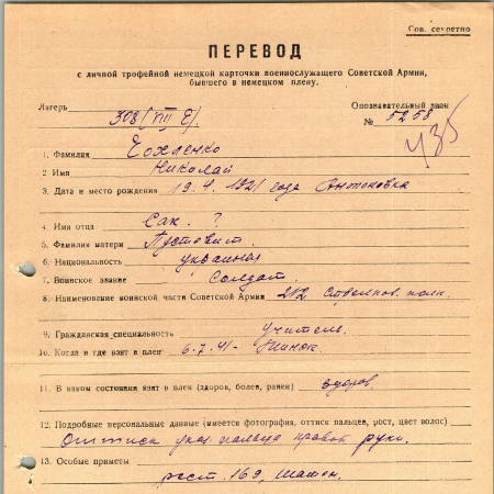 Чохленко Николай (Сак), 19.04.1921 г.р. Антоновка, Киевская область. Рядовой, 212 стрелковый полк. Попал в плен 06.07.41 в Минске.