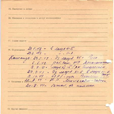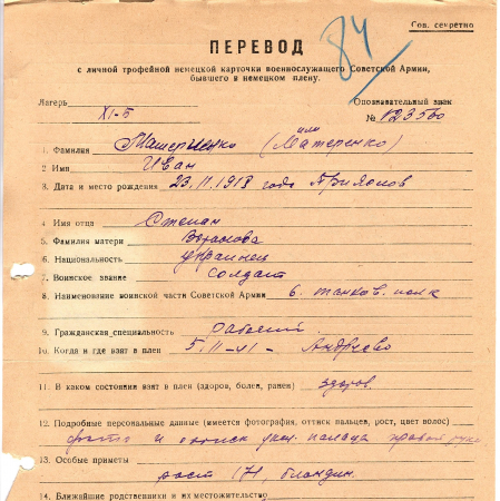 Матеренко Иван Степанович, 23.11.1918 г. р., г. Переяслав, Киевская область. Рядовой, 6 танковый полк. Попал в плен 05.11.1941 г – в Андреево. 20.08.1944 г. – бежал из плена, не пойман.