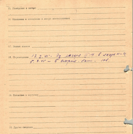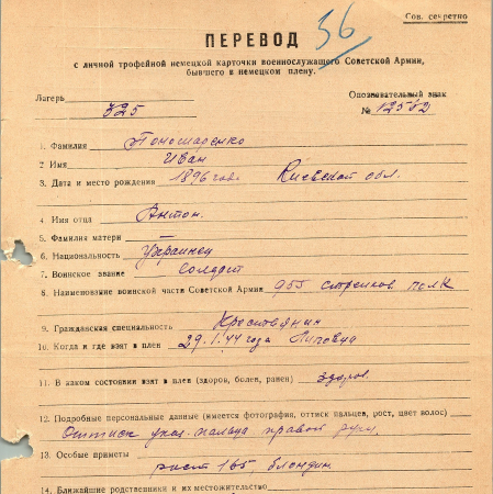 Пономоренко Иван Антонович, 1896 г. р., Киевская область. Рядовой, 955 стрелковый полк. Попал в плен 29.01.1944 г. в Липовцах, 05.03.1945 г. – отправлен в строительный батальон 106.