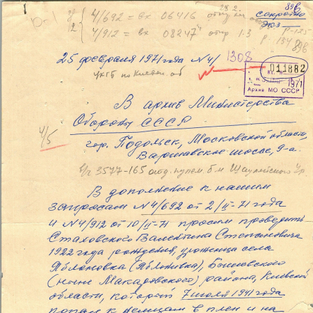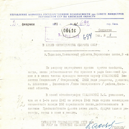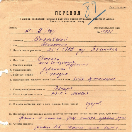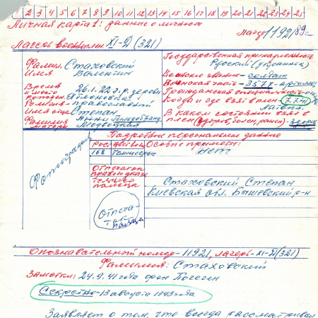 Стаховский Вадентин Степанович, 26.01.1922 г. р., дер. Яблоновка, Киевская область. Рядовой, 3577 артиллерия. Попал в плен 07.07.1941 г. в Латвии. 10.03.1944 г. – был передан на гражданскую работу на биржу труда Август-Энгельс в Деллигсен.