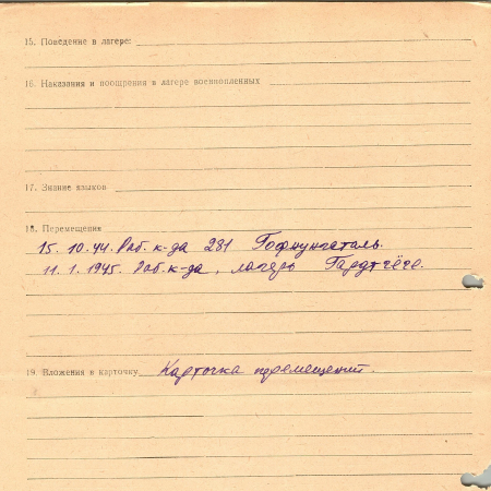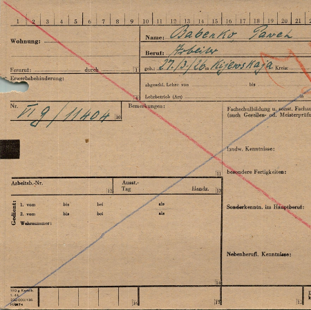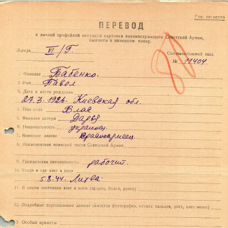 Бабенко Павел Власович, 27.03.1926 г. р., Киевская область. Рядовой. Попал в плен 05.08.1944 г. в Литве. 11.01.1945 г. – рабочая команда, лагерь Гардтгеге.