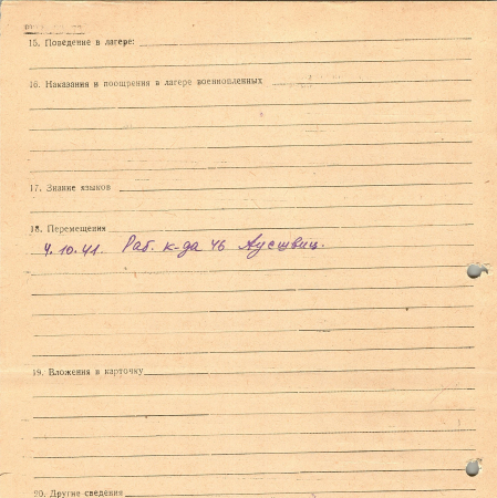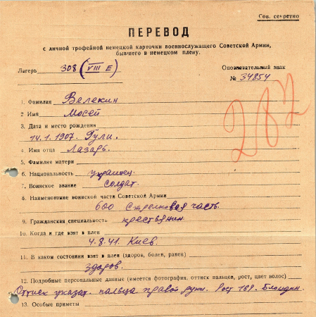 Велекин Мосей (Моисей) Лазаревич, 14.01.1907 г. р., с. Гули, Мироновский район, Киевская область. Рядовой, 600 стрелковая часть. Попал в плен 04.08.1941 г. в Киеве. 04.10.1941 г. – рабочая команда Аушвиц.