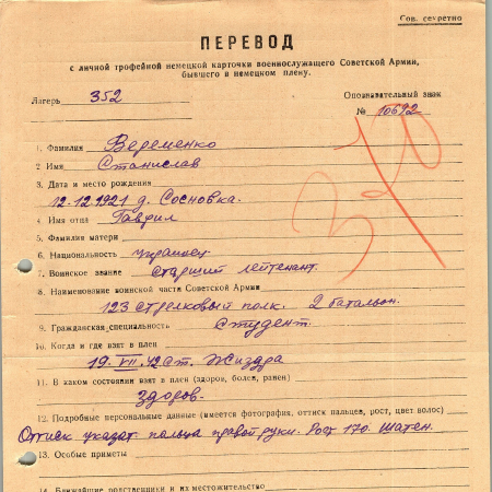 Веременко Станислав Гаврилович, 12.12.1921 г. р., д. Сосновка, Бишевский район, Киевская область. Старший лейтенант, 123 стрелковый полк, 2 батальон. Попал в плен 19.07.1942 г. в Жиздре. Бежал из лагеря.