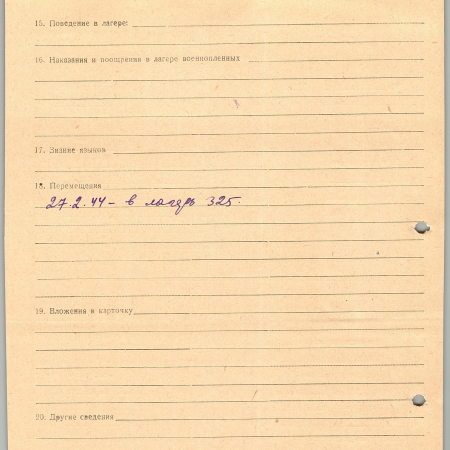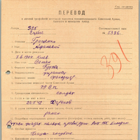 Грищенко Афанасий Семенович, 07.06.1904 г. р., Киев. Фельдшер, 79 стрелковый полк. Попал в плен 23.05.1942 г. в Харькове. 27.02.1944 г. – направлен в лагерь 325.