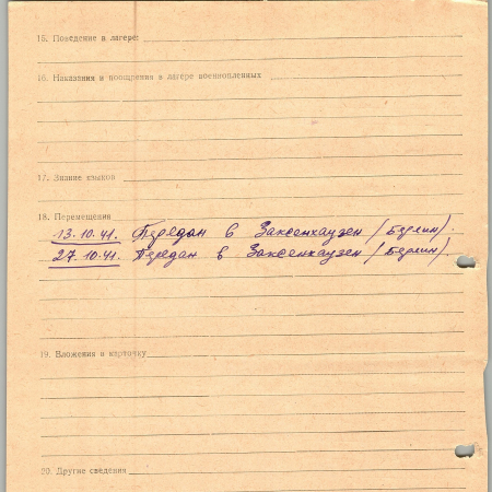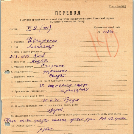 Иванусенко Александр Андреевич, 25.08.1919 г. р., Киев. Рядовой, 83 саперная часть. Попал в плен 30.06.1941 в Тукуме. 27.10.1941 г. был передан в Заксенхаузен/Берлин.