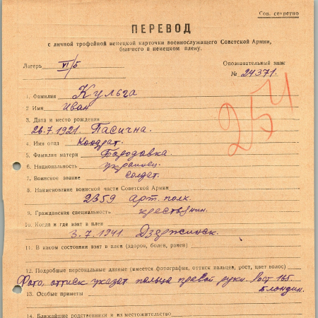 Кульга Иван Кондратьевич, 26.07.1921 г. р., Пасична. Рядовой, 2359 артиллерийский полк. Попал в плен 03.07.1941 г. в г. Дзержинск. 28.12.1943 г. – бежал из А 121 Г.В.