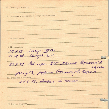 Опащенко Алексей Зосимович, 1916 г. р., с. Козловичи, Киевская область. Рядовой, 332 стрелковый полк. Попал в плен 23.05.1942 г. в Крыму. 21.06.1943 г. – бежал из плена, не пойман.