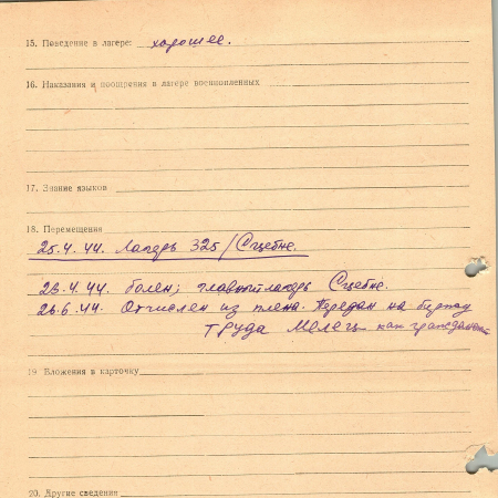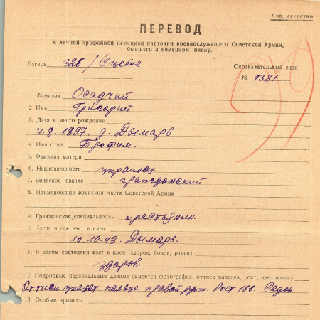 Осадчий Григорий Трофимович, 04.08.1897 г. р., д. Дымер, Киевская область. Гражданский. Попал в плен 10.10.1943 г. в д. Дымер. 26.06.1944 г. – отчислен из плена и передан на биржу труда Мелец как гражданский.