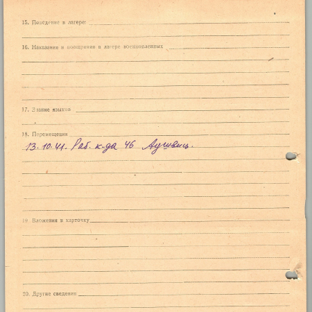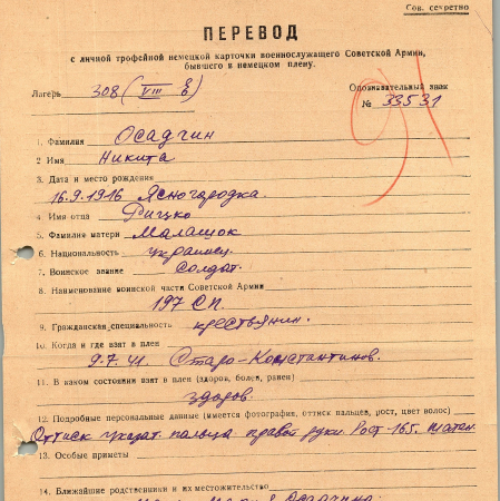 Осадчин Никита Рицкович, 16.09.1916 г. р., Ясногородка. Рядовой, 197 стрелковый полк. Попал в плен 09.07.1941 г. в Старо-Константиновке. 13.10.1941 г. – рабочая команда 46 Аушвиц.