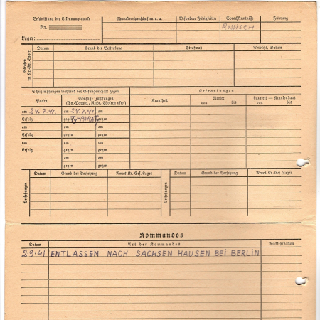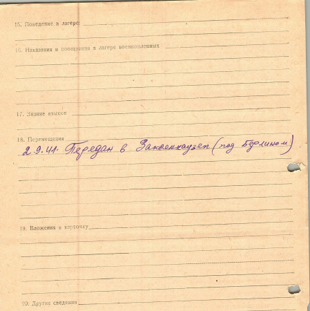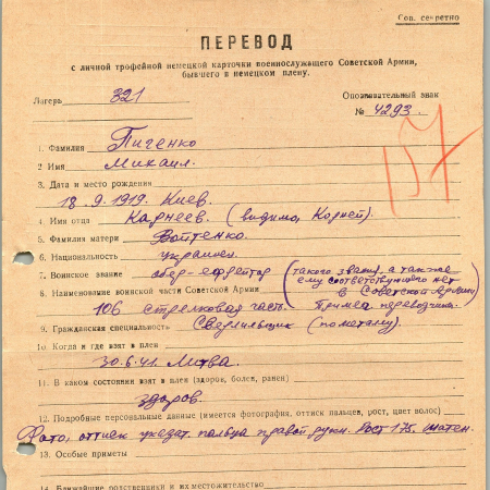 Пиченко Михаил Корнеевич, 18.09.1919 г. р., Киев. Обер-ефрейтор (такого звания нет в армии СССР), 106 стрелковая часть. Попал в плен 30.06.1941 г. в Литве. 02.09.1941 г. – передан в Заксенхаузен (под Берлином).