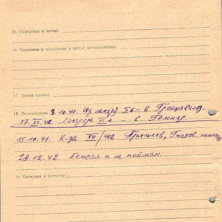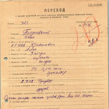 Пиздевский Иван Антонович, 01.05.1922 г. р., Красиловка. Рядовой, 94 артиллерийский полк. Попал в плен 02.07.1942 г. в г. Тукумс. 29.12.1942 г. – бежал из плена, не пойман.