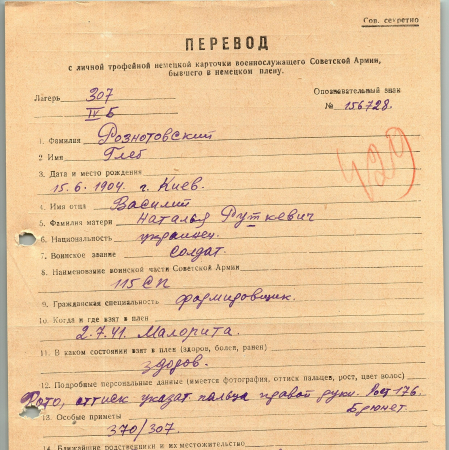 Рознотовский Глеб Васильевич, 15.06.1904 г. р., Киев. Рядовой, 115 стрелковый полк. Попал в плен 02.07.1941 г. в с. Малорита. 28.11.1944 г. – Арнсдорф, транспортная команда.