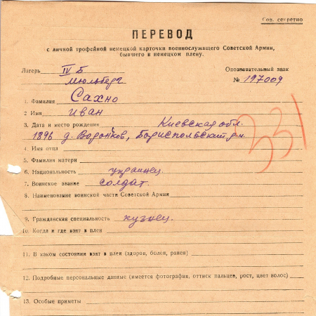 Сахно Иван, 1896 г. р., д. Вороньков, Бориспольский район, Киевская область. Рядовой. Попал в поен в лагерь IV В Мюльберг.