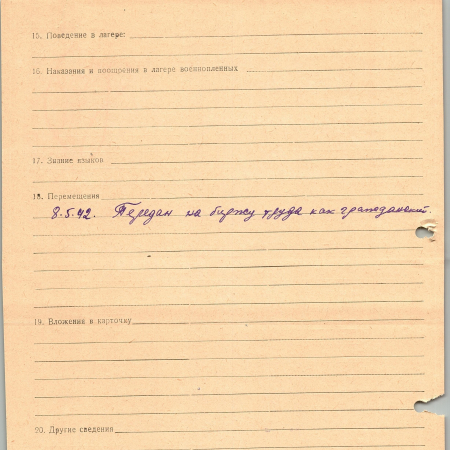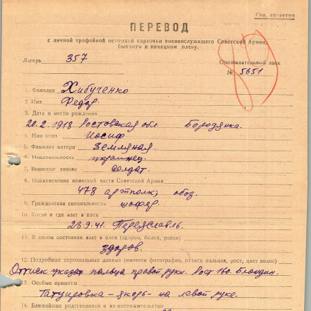 Хибученко Федор Иосифович, 20.02.1918 г. р., Ростовская область. Рядовой, 478 артиллерийский полк, обоз. Попал в плен 23.09.1941 г. в Переяславле. 08.05.1942 г. – передан на биржу труда как гражданский.