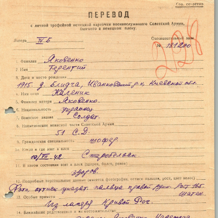 Яковенко Терентий Каленикович, 1915 г. р., д. Блидча, Иванковский район, Киевская область. Рядовой, 51 стрелковая дивизия. Попал в плен, 10.07.1942 г. в Старобельске. 06.07.1943 г. – бежал из плена.