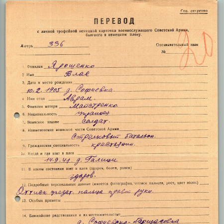 Ярошенко Влас Аврамович, 10.02.1905 г. р., д. Софиевка. Рядовой, стрелковый батальон. Попал в плен 14.09.1941 г. в д. Галици. 07.06.1943 г. – бежал из плена.