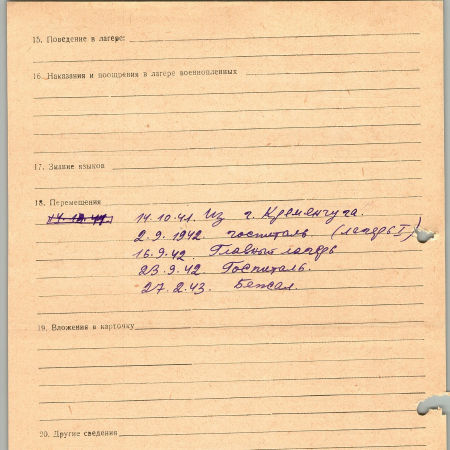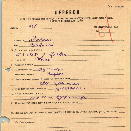 Ященко Василий Фомич, 15.03.1908 г. р., д. Кравец. Ставищанский район, Киевская область. Рядовой, 824 артиллерийский полк. Попал в плен 10.09.1941 г. в Кременчуге. 27.02.1943 г. – бежал из плена.
