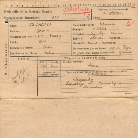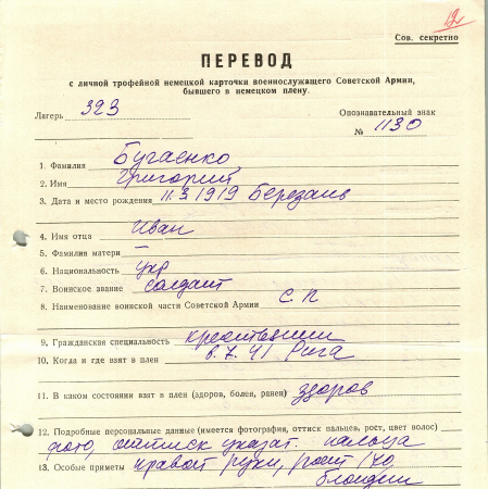 Бугаенко Григорий Иванович, 11.03.1919 г. р., г. Березань. Рядовой, стрелковый полк. Попал в плен 06.07.1941 г. в Риге. 03.05.1944 г. – бежал из плена.