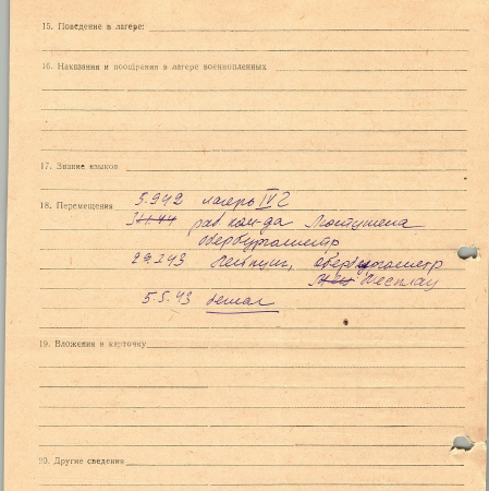 Ганжа Александр Тихонович, 13.05.1913 г. р., Киевская область, Ракитянский район, с. Остров. Рядовой, 338 саперный батальон. Попал в плен 28.06.1941 г. в г. Поневеж. 05.05.1943 г. – бежал из плена.