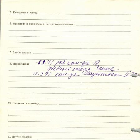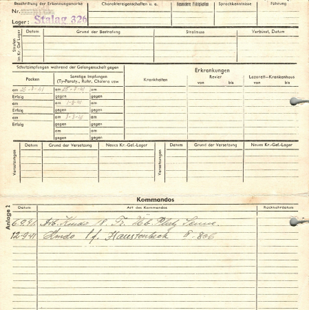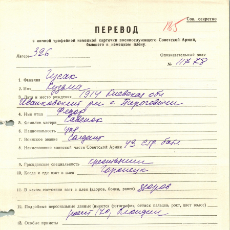 Гусак Кузьма Федорович, 1914 г. р., Киевская область, Иванковский район, с. Пироговичи. Рядовой, 43 стрелковый батальон. Взят в плен в Горонецке. 12.09.1941 г. - рабочая команда Хустенбек – II-806.