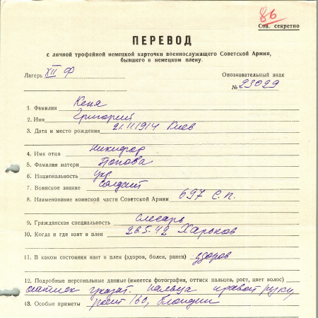 Кеня Григорий Никифорович, 21.11.1914 г .р., Киев. Рядовой, 697 стрелковый полк. Попал в плен 26.05.1942 г. в Харькове. 10.08.1942 г. – бежал из плена.